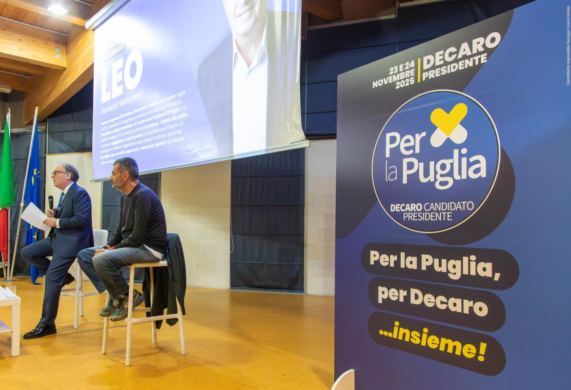 “Con la stessa passione degli ultimi dieci anni – ha continuato Leo - ma con una nuova consapevolezza, sono qui per dire che non ci fermiamo: il patrimonio di idee, di risultati e di esperienze degli ultimi dieci anni non deve andare disperso. Va messo a fattor comune, va rilanciato, va portato avanti con una nuova energia. Perché la Puglia ha ancora tanto da fare, e noi abbiamo ancora tanta voglia di farlo. E quella nuova energia, quella spinta che serve a dare continuità ma anche visione di futuro, ha un nome e un volto: Antonio Decaro. Antonio è la persona giusta, nel momento giusto. Perché porta con sé la concretezza di chi conosce i territori, la passione di chi ascolta, la forza di chi sa costruire. La sua è una visione nuova, che guarda avanti, ma non dimentica da dove veniamo. Una visione che parte dalle persone, dalle comunità, dalle storie quotidiane. Antonio rappresenta quella Puglia che non si accontenta, che non arretra, che crede nel futuro. E io, insieme a tanti di voi, sono orgoglioso di essere al suo fianco”.
